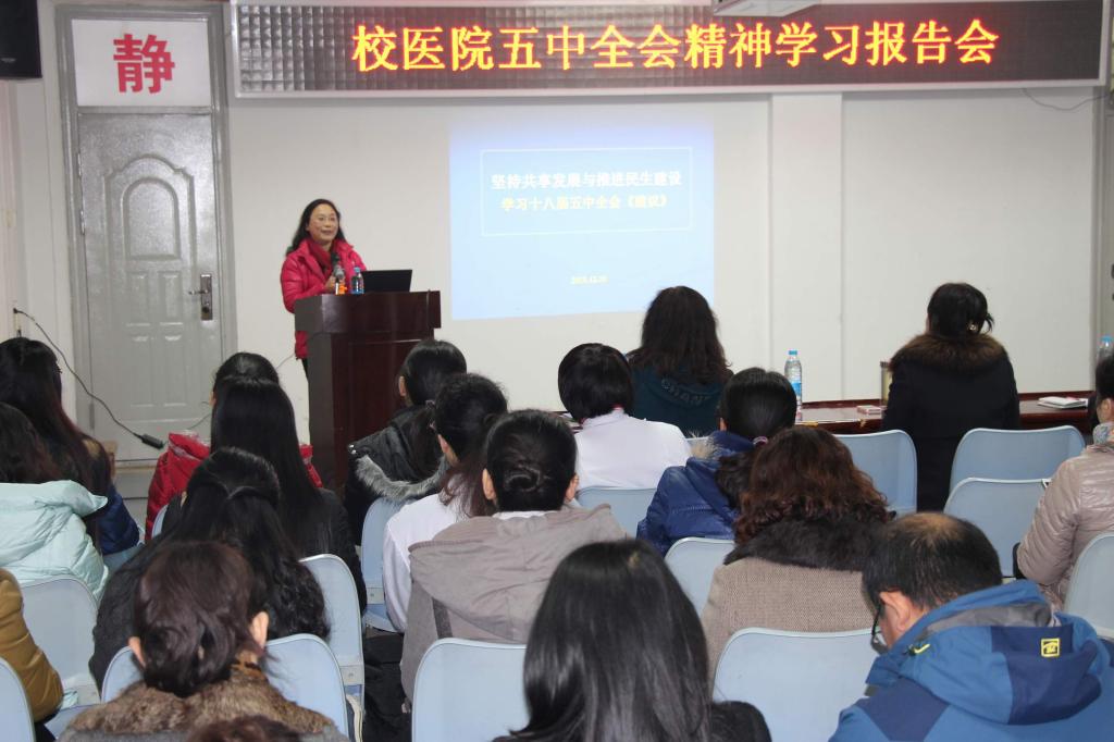 12月10日,校医院召开五中全会精神学习报告会,会议由党委副书记洪燕同志主持,谭金海院长,关秀萍副院长及全体党员干部和职工参加会议。会议邀请学校贯彻学习党十八届五中全会精神讲师团成员李楠教授来院主讲专题辅导讲座。
