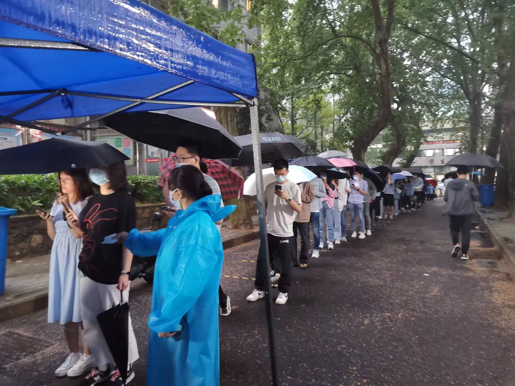 4月22日倾盆大雨由天而降,淹没了整个校园,在社区的工作人员积极配合下,建立雨棚、拉警戒线、座椅板凳按要求摆放到位,按严格的标准,群策群力,群防群控,用最规范、严谨的操作方式,为居民筑起疫情防护墙。下午15:30采样通道准时开放,社区工作人员安排人员录入、维持现场秩序、发放核酸采样卡等工作。