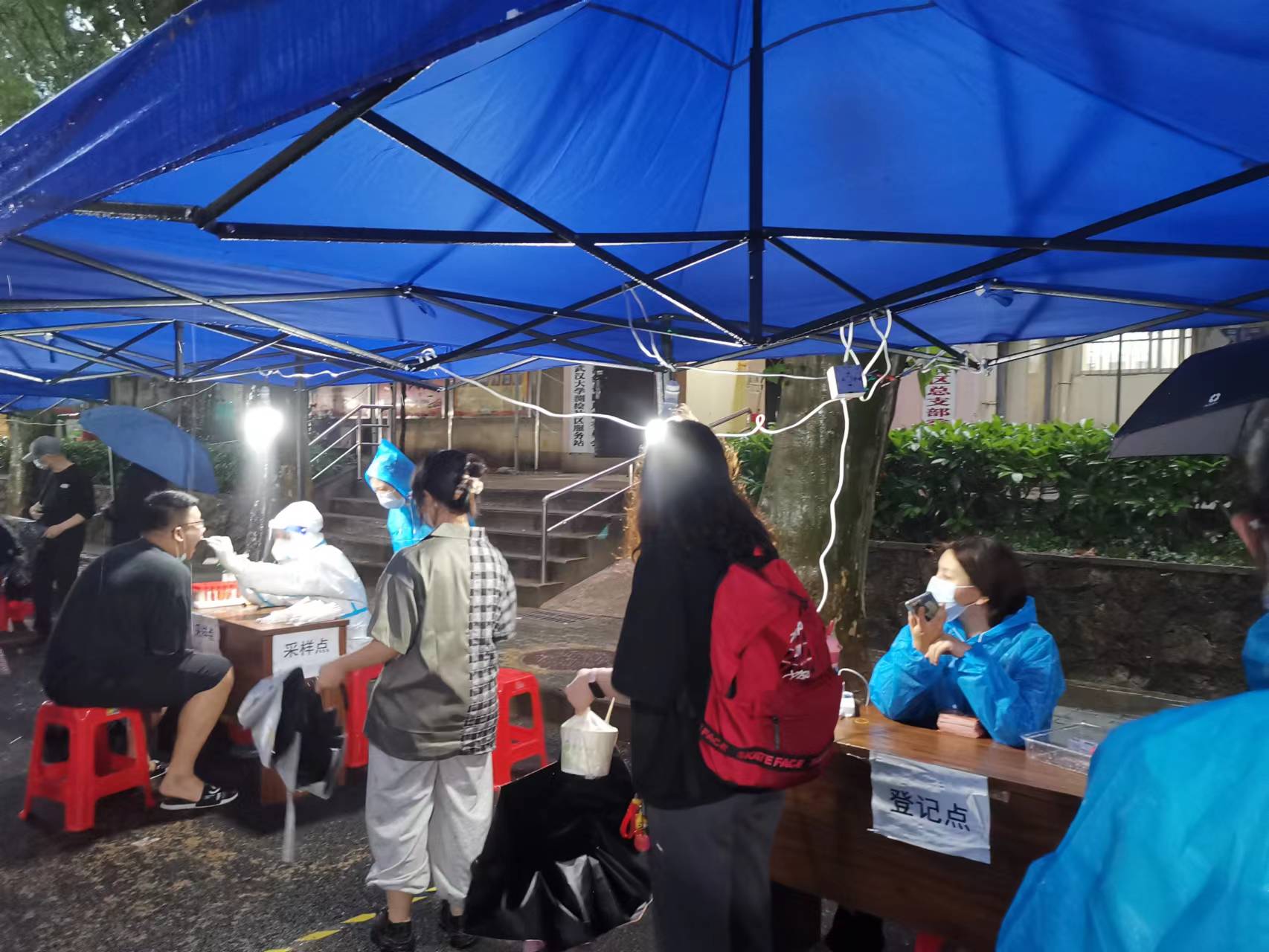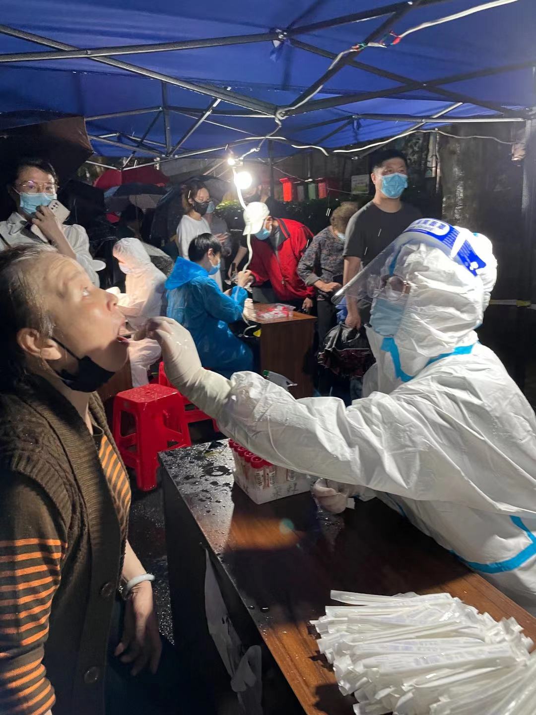 我们负责核酸采样,白衣天使是对医护人员最美好的称赞,殊不知我们也是一名普普通通的人。放弃与家人团聚、休息的时间,凭借着一腔热血和高尚的职业道德,一次又一次深入前线,与病毒勇敢博弈。即便是大雨滂沱、双手浮肿、浑身湿透、满脸印痕,我们依然背负起使命,坚持到最后一刻,无怨无悔地进行核酸采样工作,一直到晚上21:30结束。