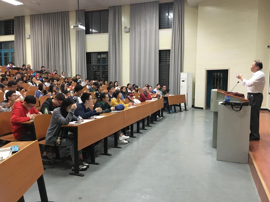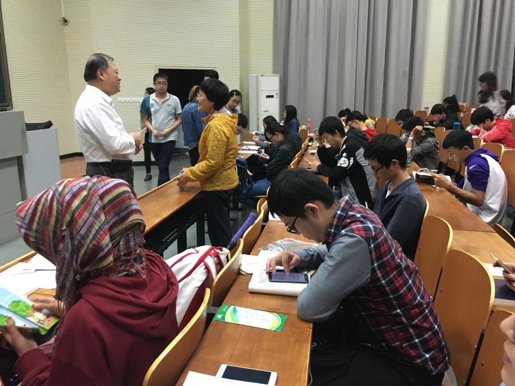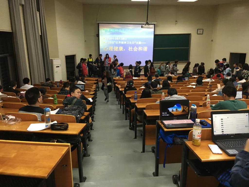 【注:刚上任的中华预防医学会健康传播分会委员廖皓磊,正在武大教室向大学生发放健康教育资料;......】
